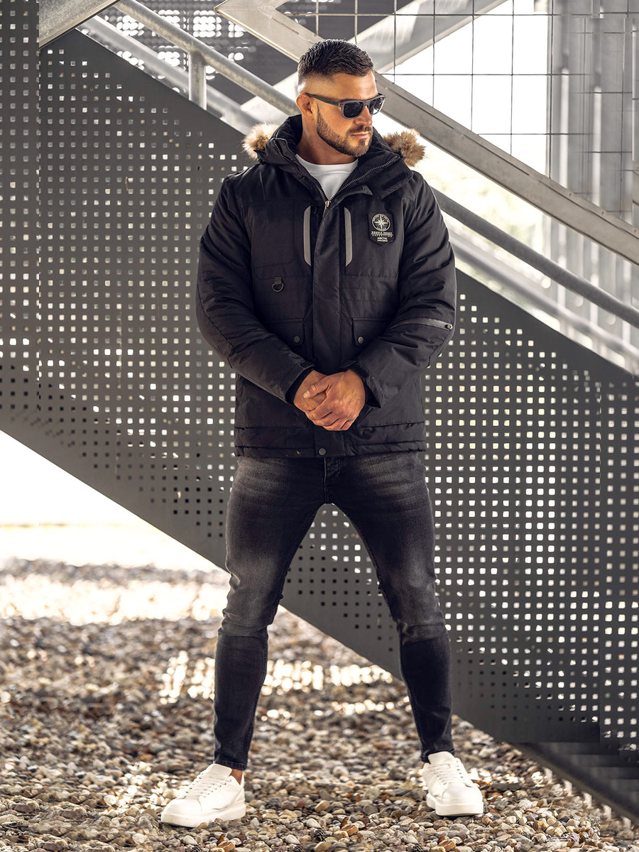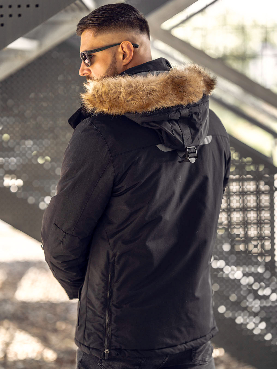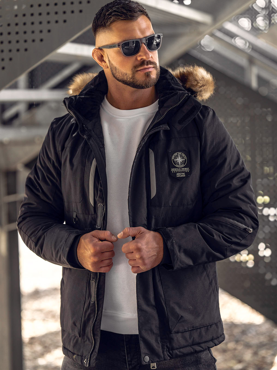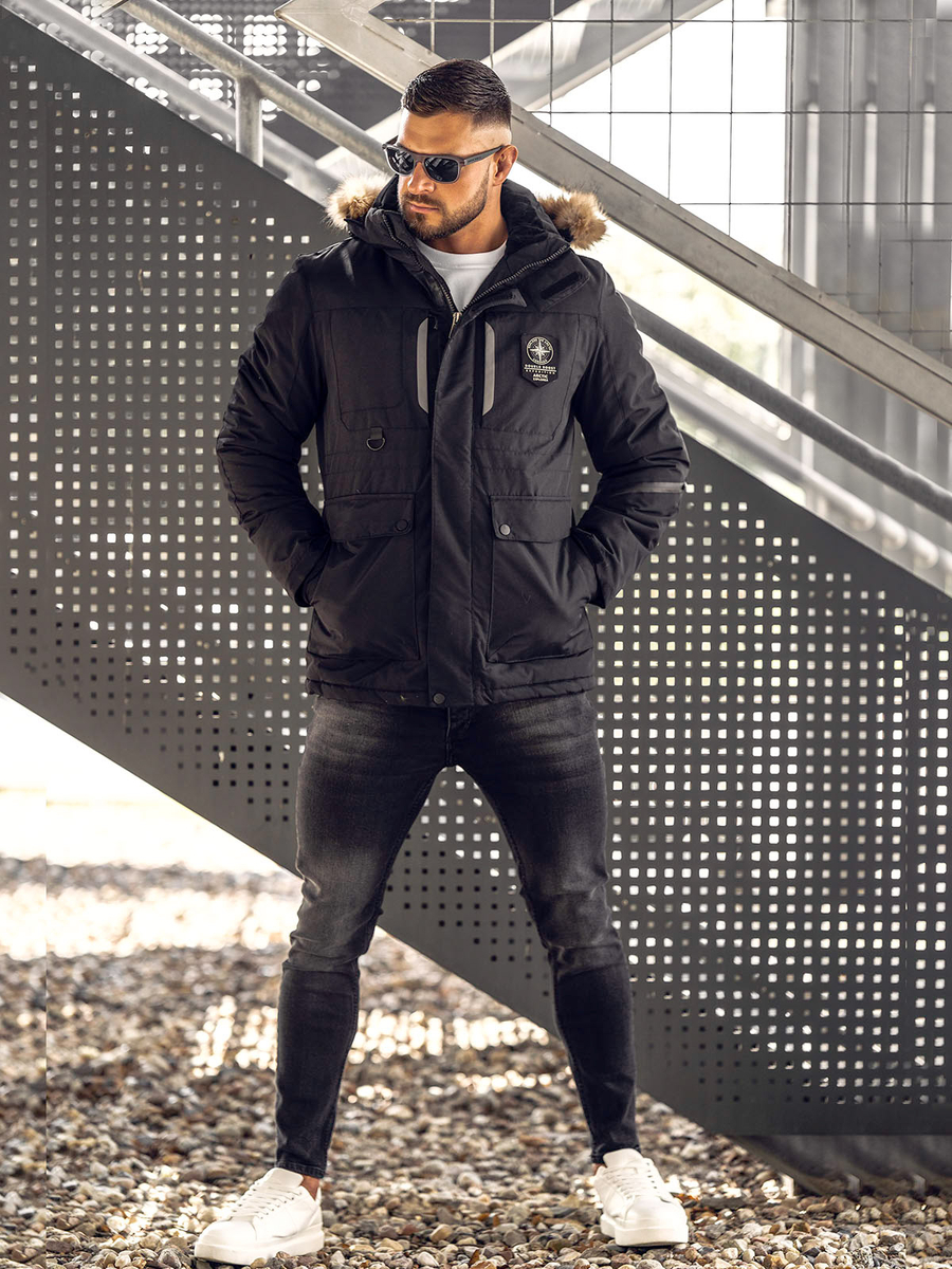 Практични и топли черни зимни якета Bolf. Имат 6 големи джоба и подвижна качулка с изкуствен косъм. Перфектен за студените дни, има маншети на ръкавите, двойно закопчаване и шнур от вътрешната страна. Черно мъжко яке се съчетава добре с дебел пуловер и дънки.