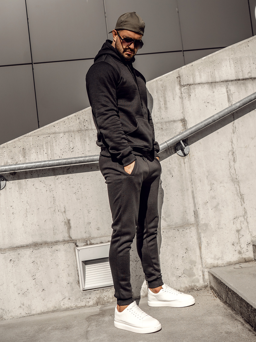Мъжкият черен анцуг с качулка Bolf D003A е комплект, който е идеален за всякакви спортни дейности. Комплектът включва суитшърт с качулка и долнище. Долнището се регулира в кръста с широк ластик и връзки, има два странични джоба. Спортен характер му придава опростената, вталена кройка. Продуктът е изработен от мека, приятна на допир материя. Може да бъде универсална основа за изграждане на ежедневни или спортни тоалети. Суичърът и панталоните могат да се комбинират с други дрехи, като по този начин се получават много възможности за създаване на ежедневни стилизации. Чудесно се комбинира с тениска , с леко яке, преходно яке или спортно яке. Може да се носи за всеки ден или за спортуване на открито или във фитнес зала.