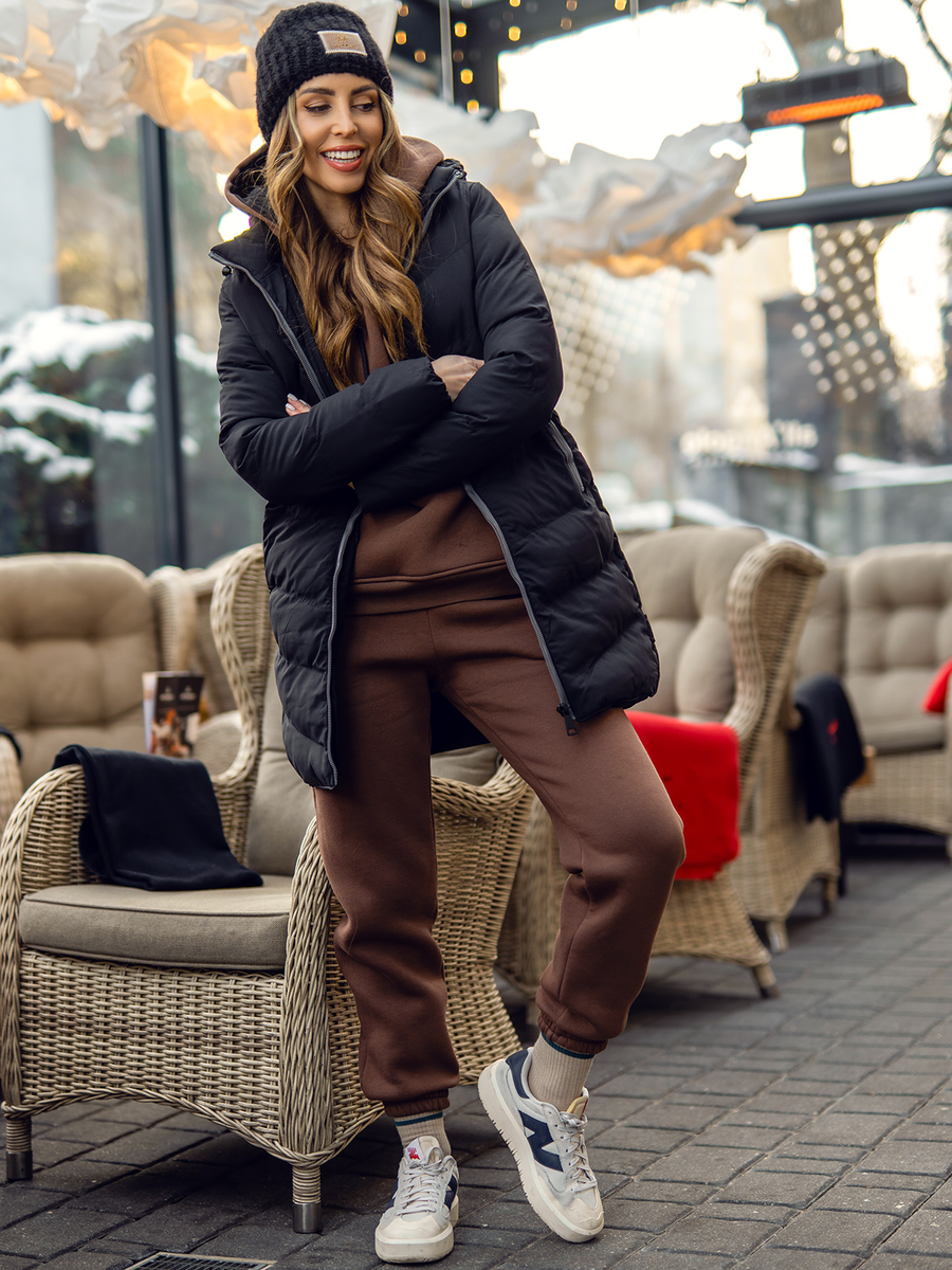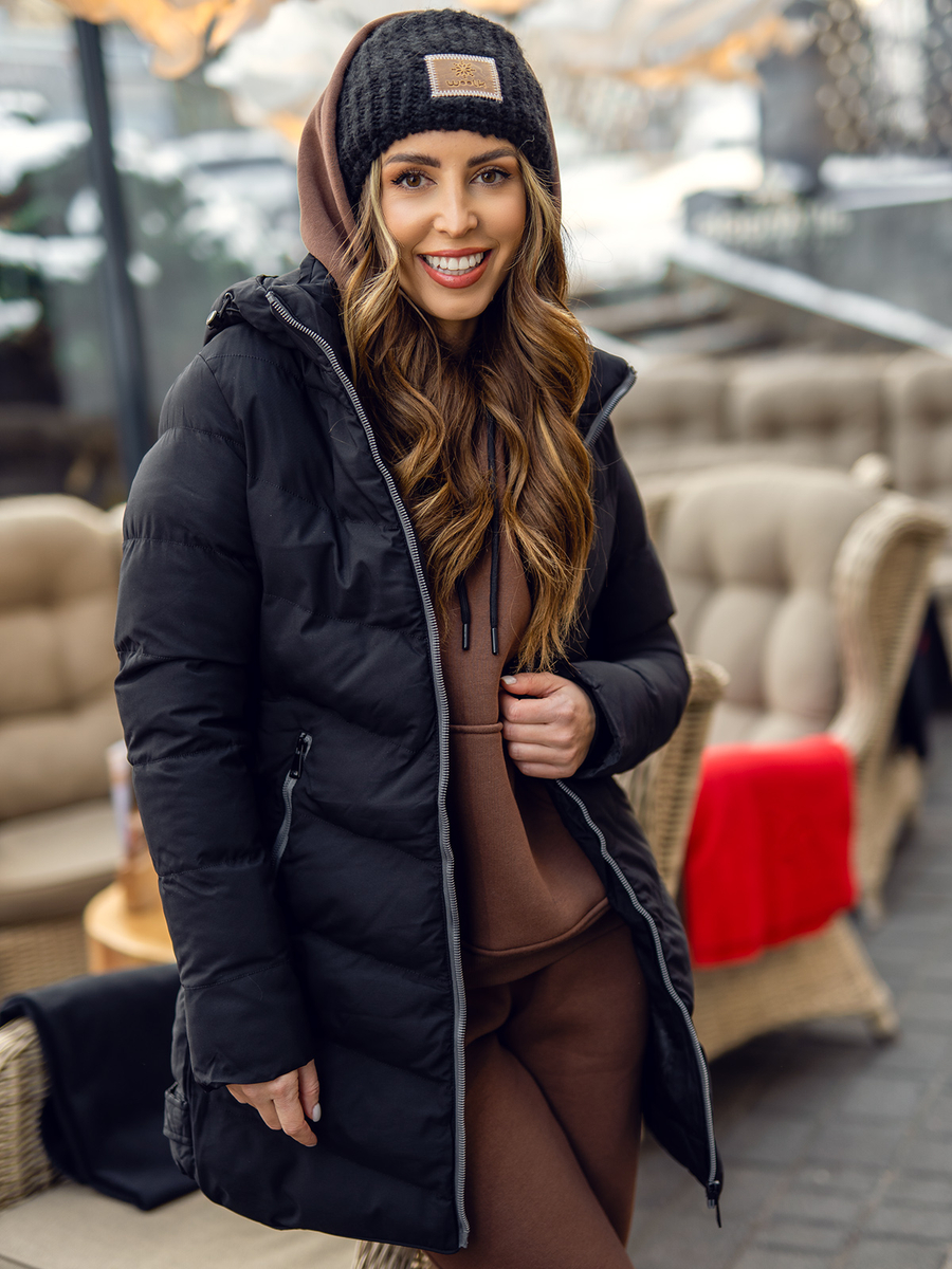 Черно дълго капитонирано дамско зимно яке с качулка Bolf 7089A