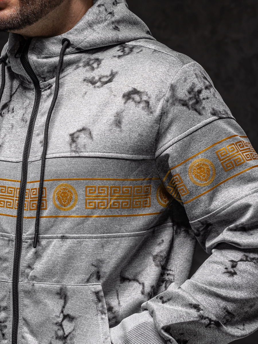 Сивият мъжки суичър с качулка и цип Bolf 27B8125A1 е вечната класика за ежедневни стилизации. Суичър с класическа кройка, с регулируема качулка, идеален за любителите на спортния стил. Дизайнерският принт му придава уникален, модерен характер. Ръкавите и долния подгъв на горнището са завършени с щрик, който осигурява защита от вятър и студ. Има два странични джоба без закопчаване. Изработен е от много приятна материя, която ще осигури комфорт дори по време на най-натоварващата тренировка. Търсите ли спортно облекло? Съчетай суичъра с долнище, тениска и <a3>елек</a3>!