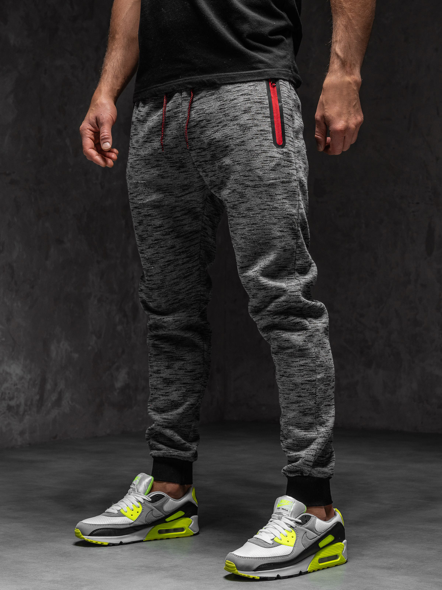 Мъжки графитен спортен панталон Bolf с неравномерен принт. Стои идеално, има 2 джоба с цип и практичен колан, а също контрастни вложки на джобовете. Можеш да обличаш графитеният мъжки панталон в различни стилизации. Носи го с тениска, блуза с дълъг ръкав или суитшърт.
