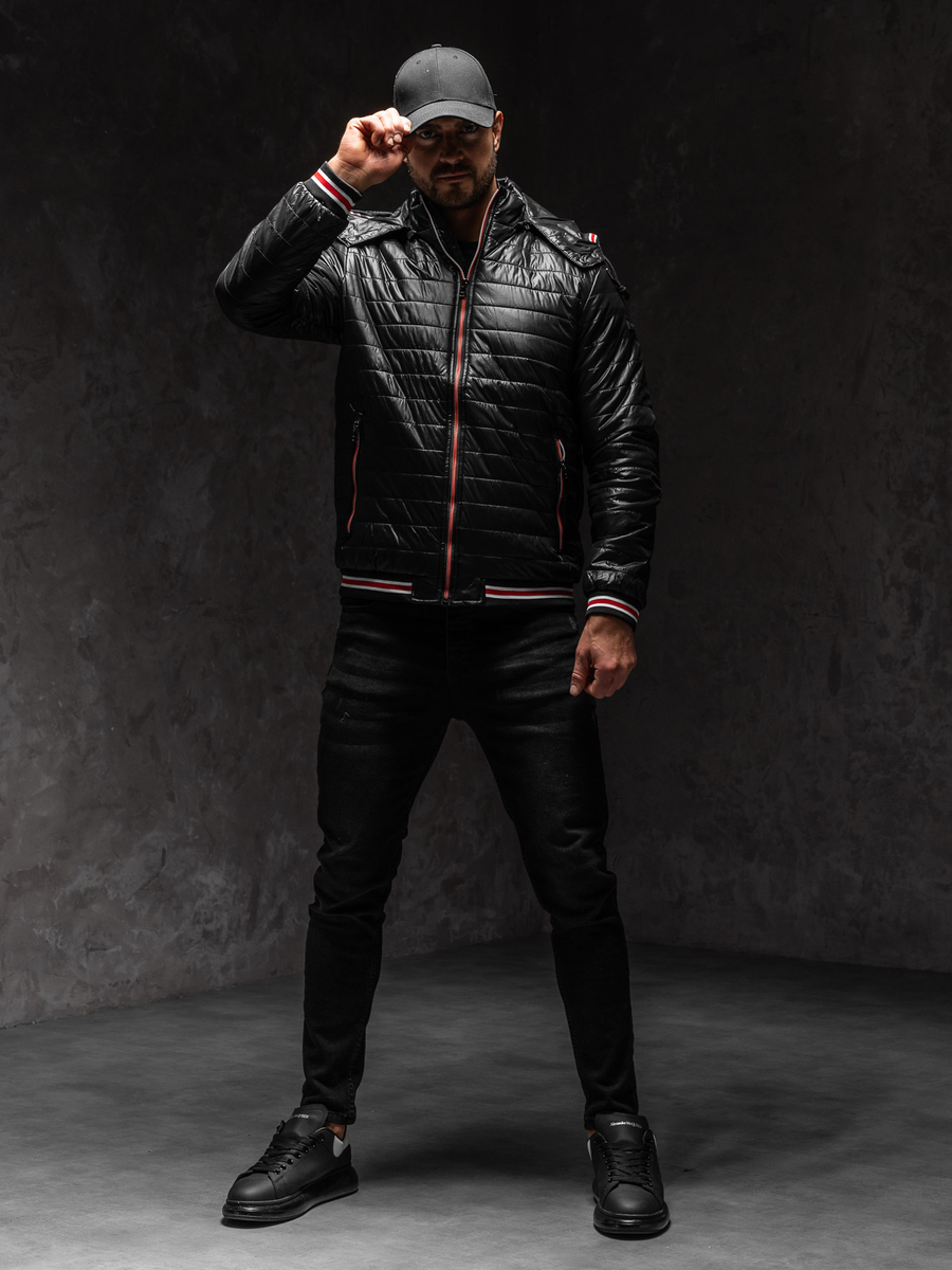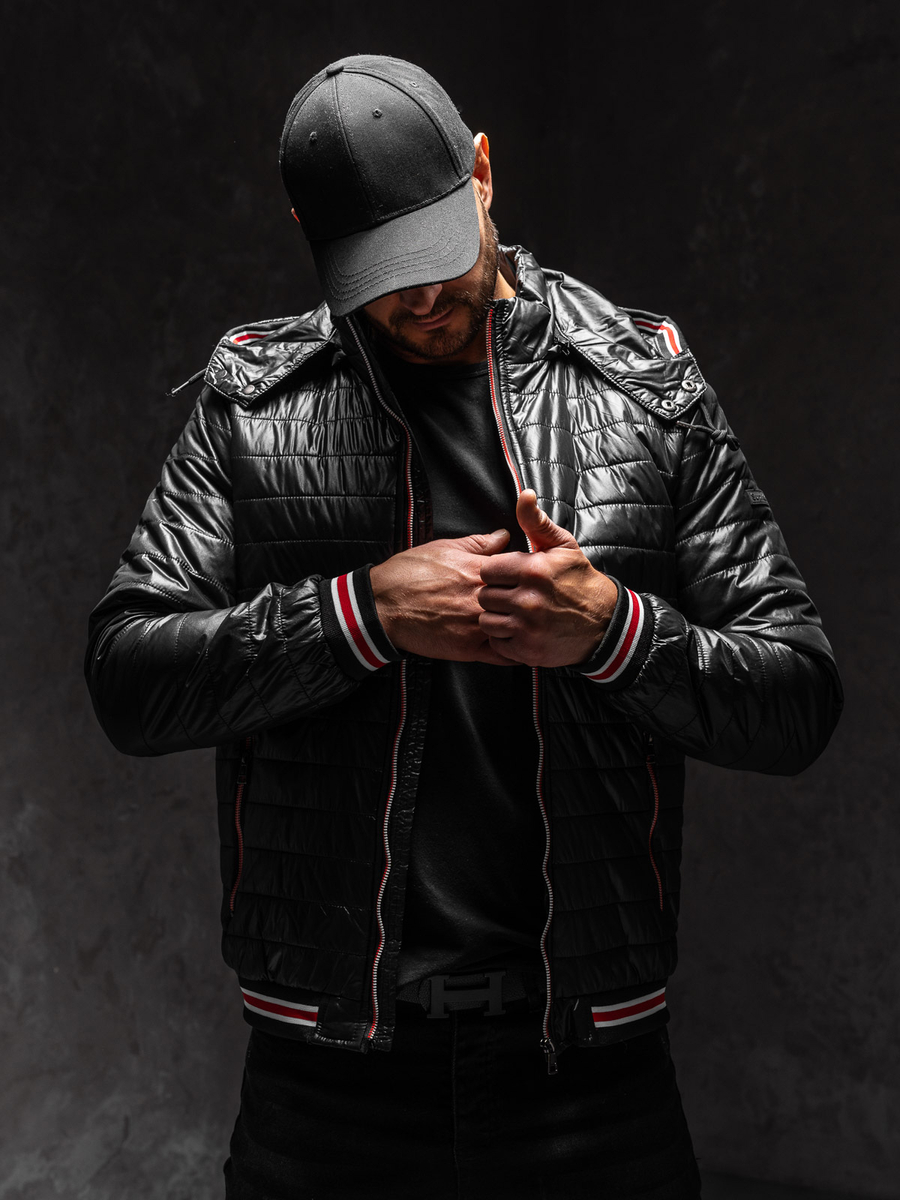 Черното преходно мъжко ватирано яке Bolf 6191 е с оригинални декорации на маншетите и качулката, което го прави отличително и забележимо. Якето е капитонирано по цялата си повърхност. Този модел е с цип и има висока яка. Ръкавите, качулката и долният подгъв са завършени с широк, черен еластичен маншет с бяло-червени ленти, което добавя спортен характер на якето. Има два практични външни джоба с цип. Сваляща се качулка, регулируема с връзки.