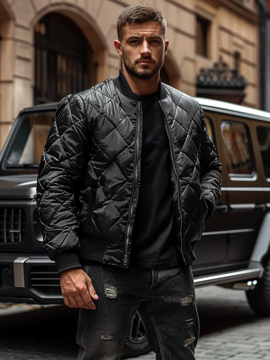 Черното преходно мъжко ватирано бомбър яке от Bolf MY-01A2 е модерна класика сред бомбър якетата. Благодарение на своята изчистеност и универсалност, якето може да се носи през много сезони. Якето бомбър се вписва перфектно в най-новите тенденции, изработено е от приятна на допир материя. Капитониране на ромбоиди. Има малка висока яка и се закопчава с цип. Ръкавите, яката и долният подгъв са завършени с широк еластичен маншет. Якето има два практични, външни джоба с цип. Допълнително джобче на левия ръкав с цип.