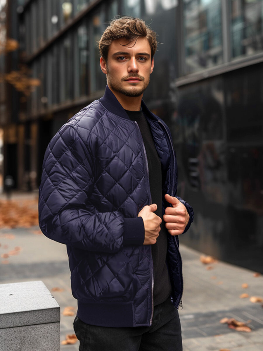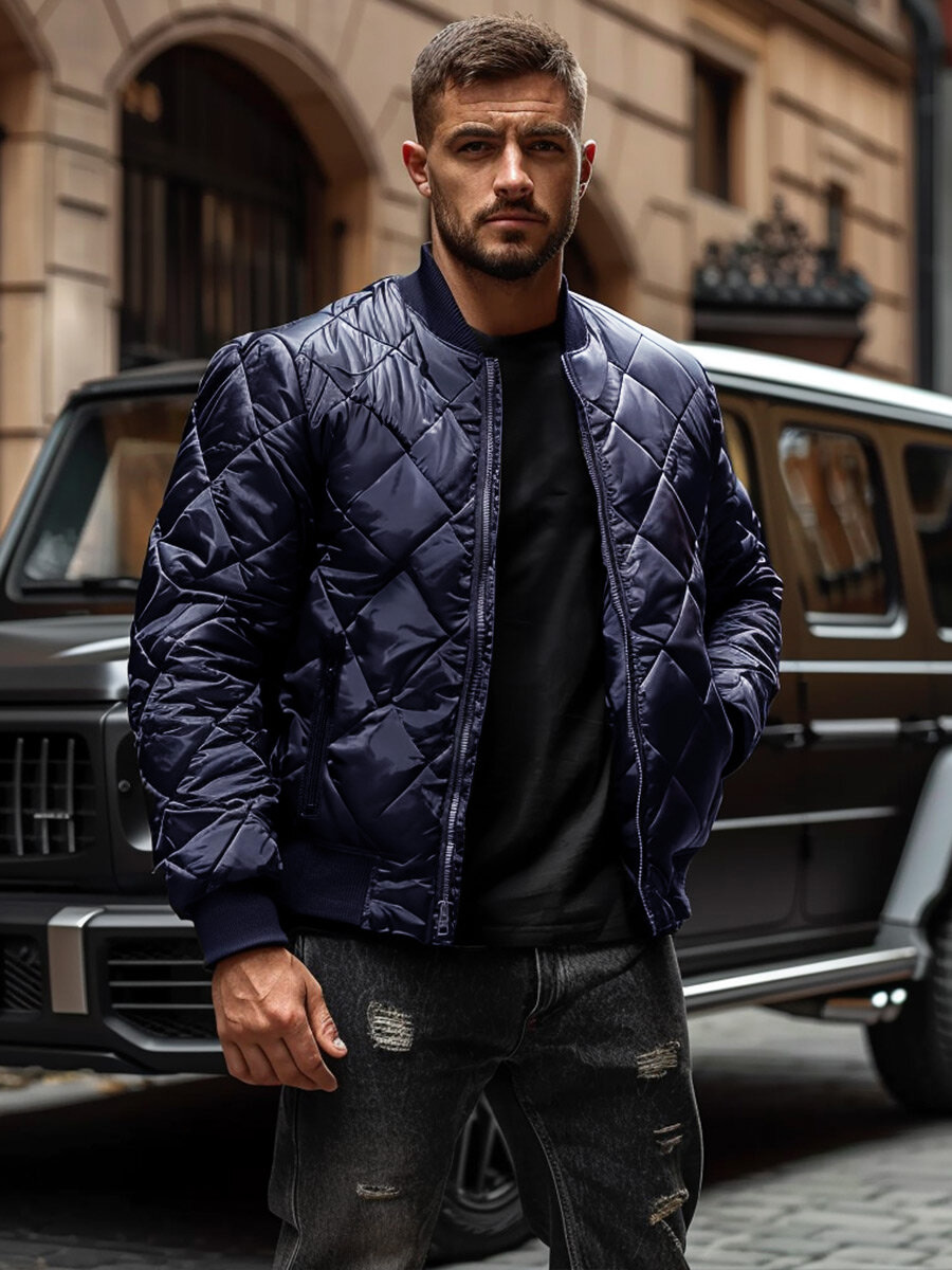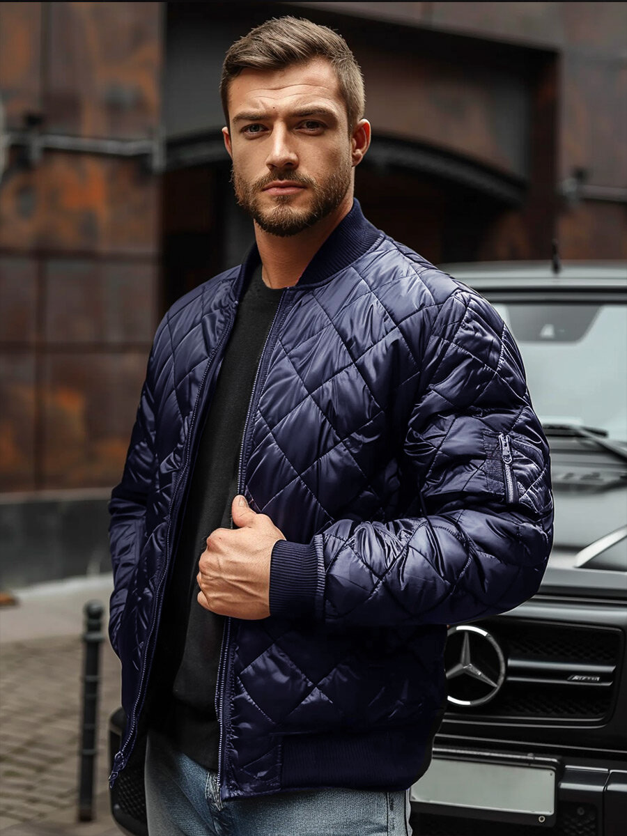 Тъмносиньото преходно мъжко ватирано бомбър яке от Bolf MY-01A2 е модерна класика сред бомбър якетата. Благодарение на своята изчистеност и универсалност, якето може да се носи през много сезони. Якето бомбър се вписва перфектно в най-новите тенденции, изработено е от приятна на допир материя. Капитониране на ромбоиди. Има малка висока яка и се закопчава с цип. Ръкавите, яката и долният подгъв са завършени с широк еластичен маншет. Якето има два практични, външни джоба с цип. Допълнително джобче на левия ръкав с цип.