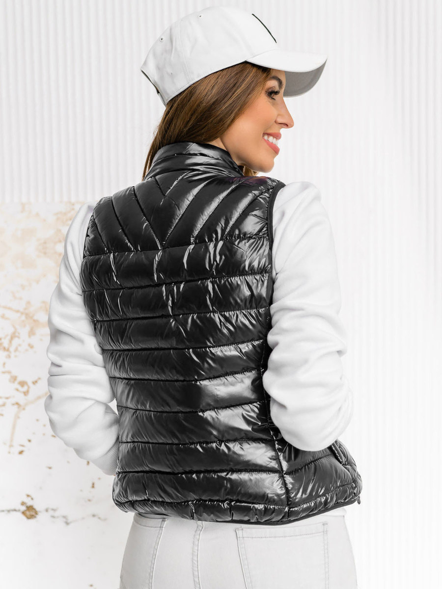 Черната ватирана дамска жилетка Bolf R0107A е идеална за създаване както на спортен, така и на градски стил.Капитонирането по цялата повърхност придава спортен характер. Този модел е с цип и има висока яка. Закопчава се с цип и има два външни джоба с ципове, които му придават практичен характер. Изработен е от 100% найлон, което го прави изключително удобен. Този елек с класическа кройка ще бъде чудесна алтернатива на якето през есенния и пролетния сезон. Може успешно да замени преходното яке или суичъра, осигурявайки защита срещу студ и вятър. Елекът може да се използва като основа за много модни стилове. Ще изглежда страхотно с долнище и суичър , създавайки спортен, свободен outfit. Перфектно се съчетава също и с дънки и T-shirt.