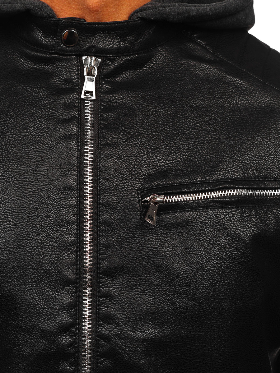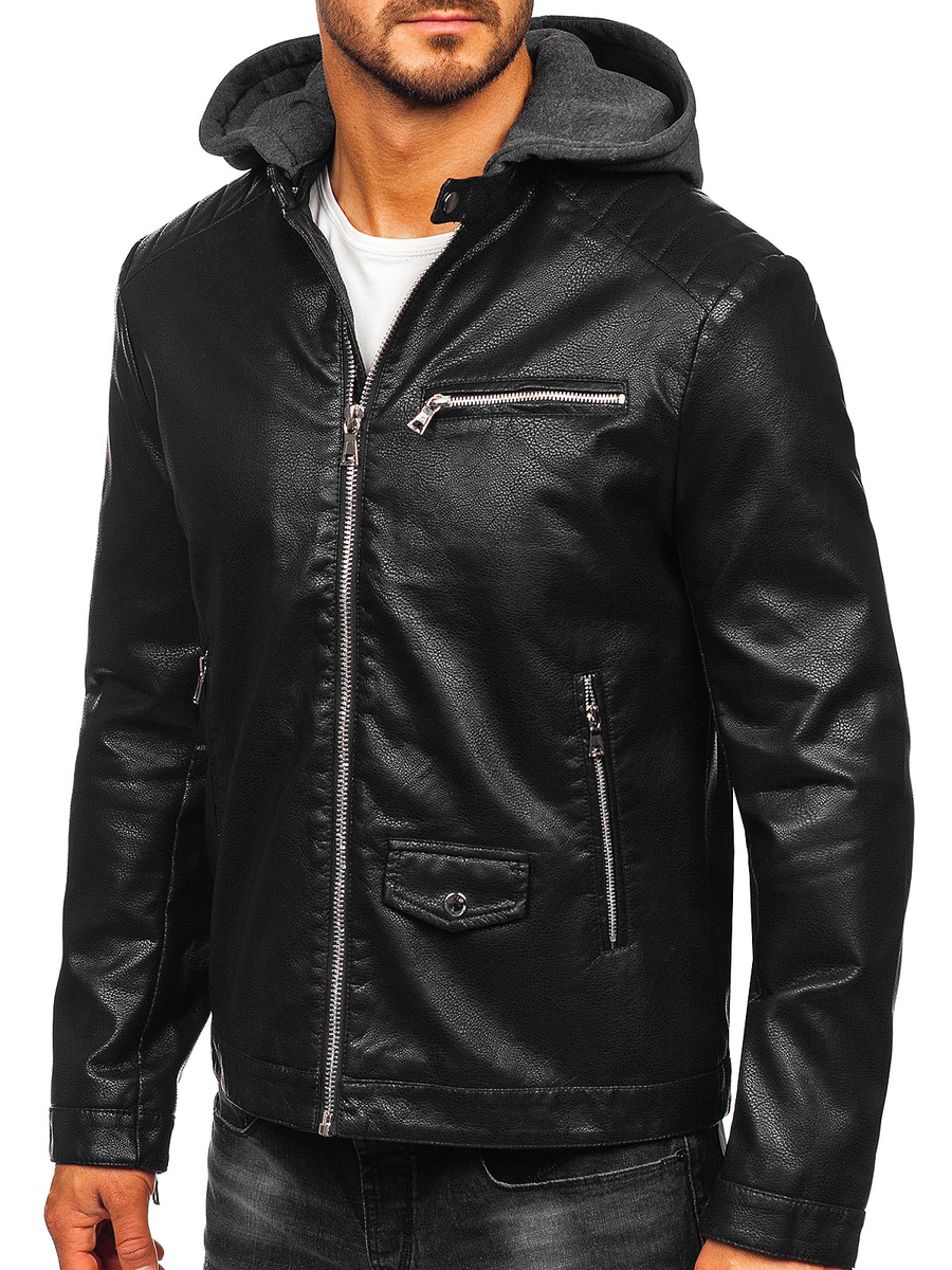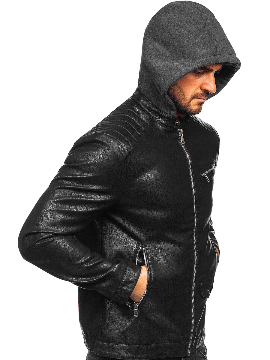 Мъжко черно кожено мотоциклетско яке с качулка Bolf 11Z8022