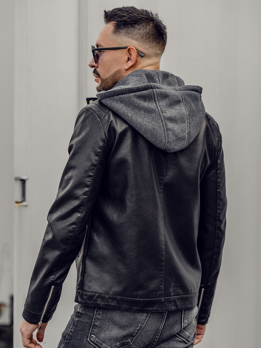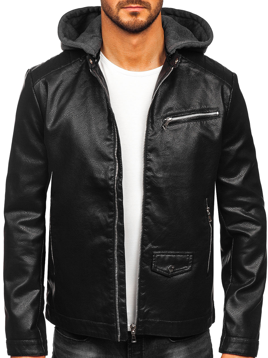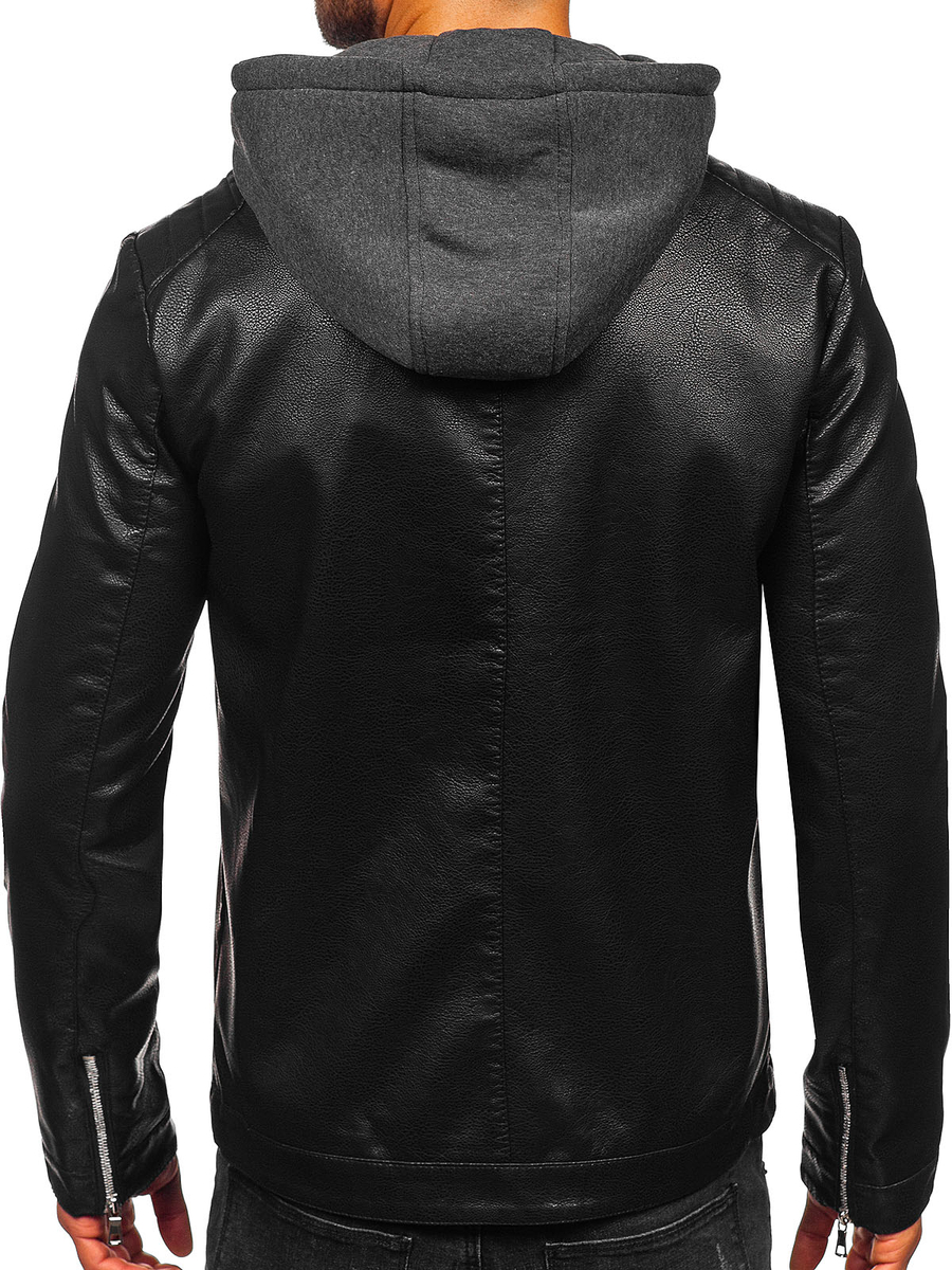 Мъжко черно кожено мотоциклетско яке с качулка Bolf 11Z8022