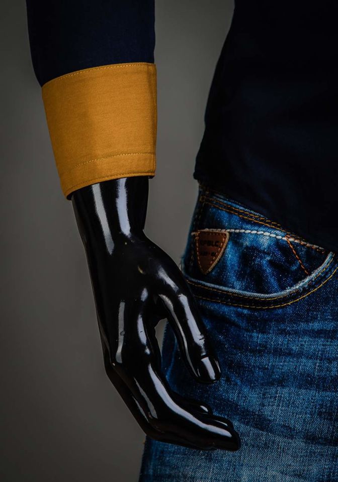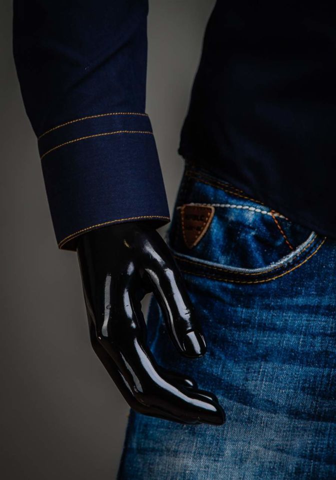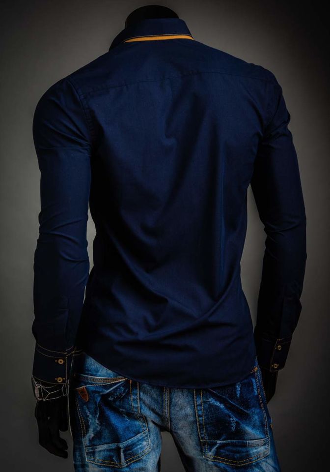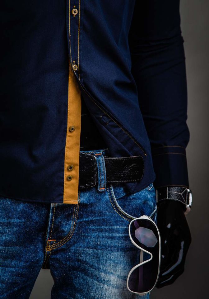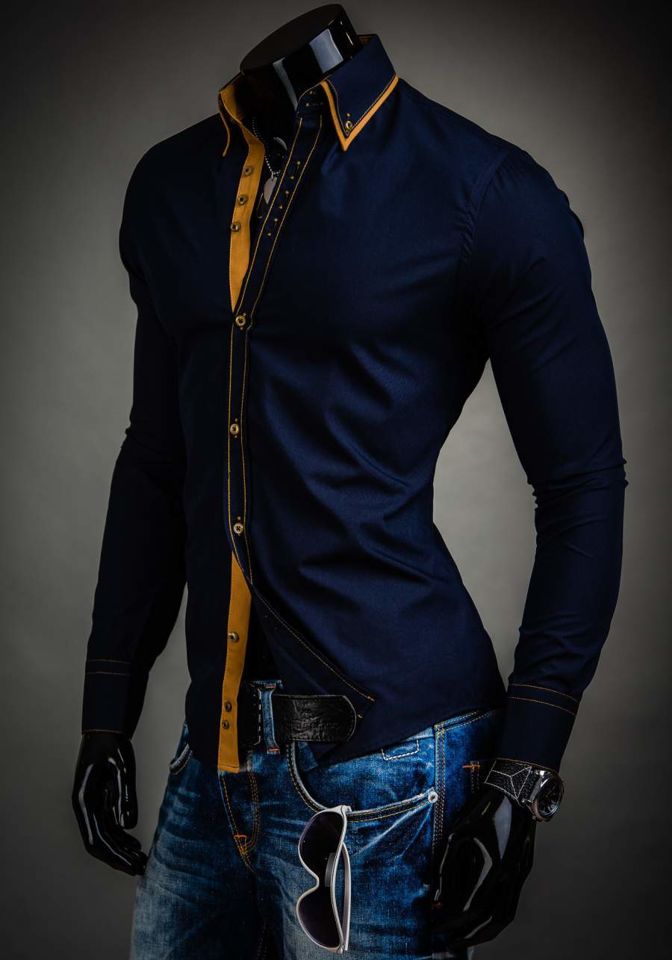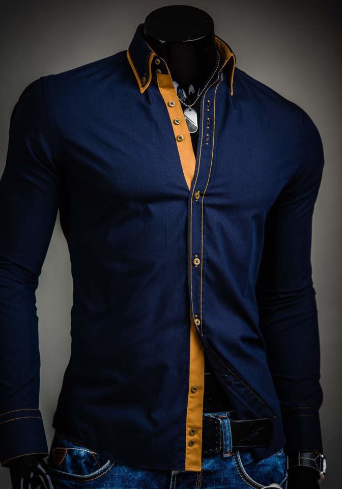 Стилни, прилепнали мъжки ризи Bolf с двойна яка. Имат контрастни вложки. Тъмносинята мъжка риза е вталена и ще се съчетава идеално с тоалети със сако, панталон панталон или кожено яке. Идеална за всеки ден и за специални поводи.