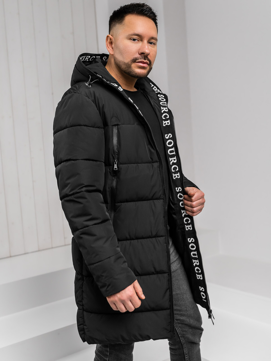 Черно дълго ватирано мъжко зимно яке с качулка Bolf 22M329