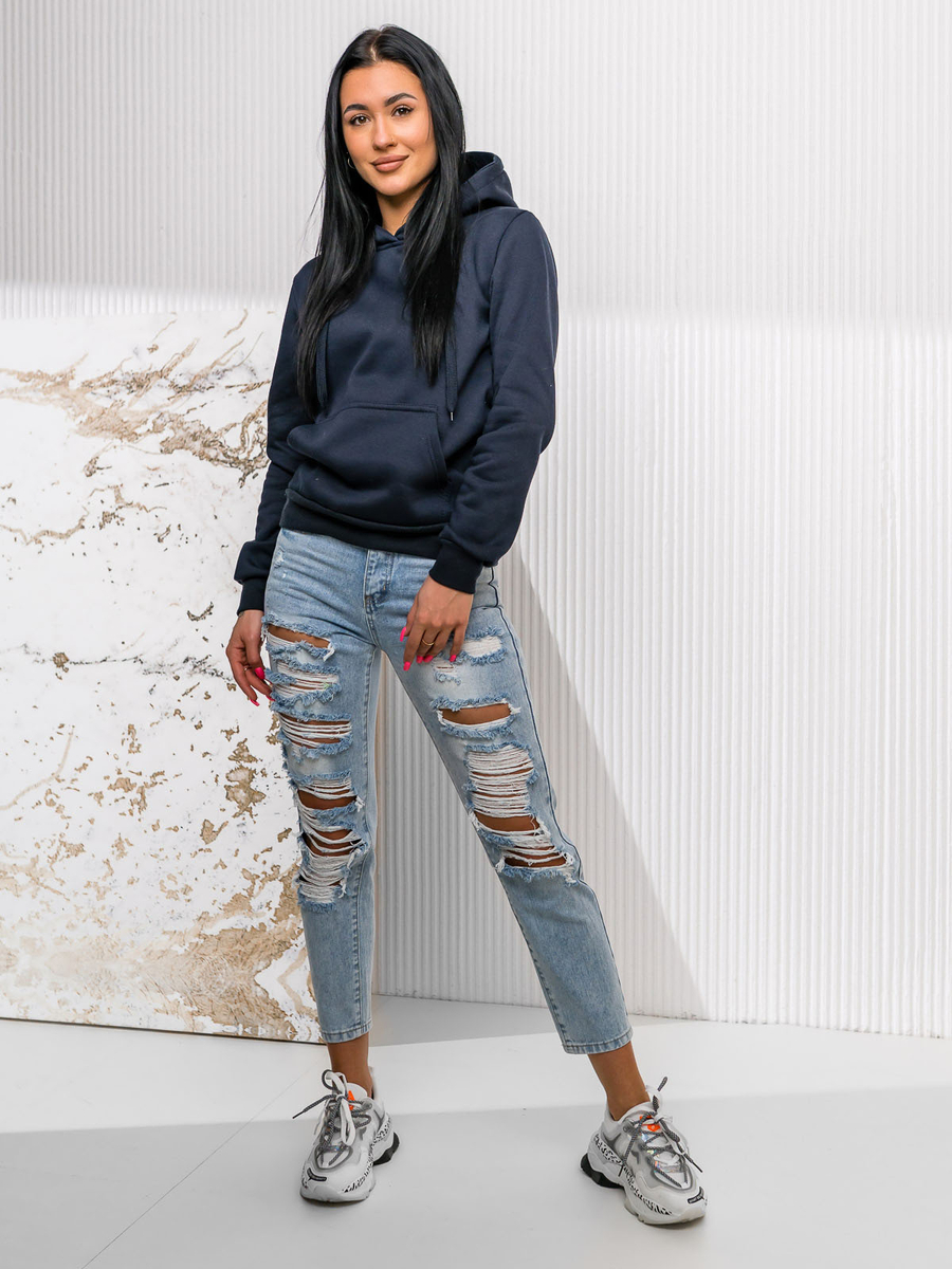 През главата се облича тъмносин дамски суичър Bolf W02A1. Това е класически суитшърт, изработен от мек, приятен на допир трикотаж. Суитшъртът е наличен в различни интересни, както интензивни, така и по-приглушени цветове. Той има регулируема с шнур качулка в плътен цвят и практичен джоб кенгуру отпред. Долната част и ръкавите са завършени с еластичен маншет. Суишъртът се препоръчва предимно за жени, които обичат минимализма и спортния комфорт в модата. Ушит е много добре и е удобен. Те са задължителен елемент във всеки дамски гардероб. Простият класически стил в интересни цветове прави този модел суитшърти идеален завършек на много ежедневни и street стилизации. Елегантният дамски суитшърт с качулка е предложение, което си струва да имате в гардероба си не в един, а дори в няколко цветови варианта. Суичърът ще ви послужи при много обстоятелства по всяко време на годината и за почти всеки свободен и небрежен стил.Стои добре на всяка фигура. Подходящ е за тренировки, разходки или пътувания до града с приятели, както и за пътуване и опознаване на интересни кътчета на света. Той ефективно предпазва от студа, като същевременно добавя девствена свежест и чар на жената. Добре се съчетава с дънки, клинове или спортно долнище. Суитшърът е подходящ за спорт на открито, също така си струва да го има в куфара по време на пътуване до планината и на всяко туристическо пътуване. Суитшърът е силно препоръчан от феновете на Bolf. Той има огромен кръг от фенове сред редовните клиенти на Bolf, както и нашите спонсори и Instagram звезди. Ниската цена го прави по джоба на всеки. Суитшърът е полезен при много случаи. Винаги си струва да го носите със себе си и да носите тениска в хладно време.